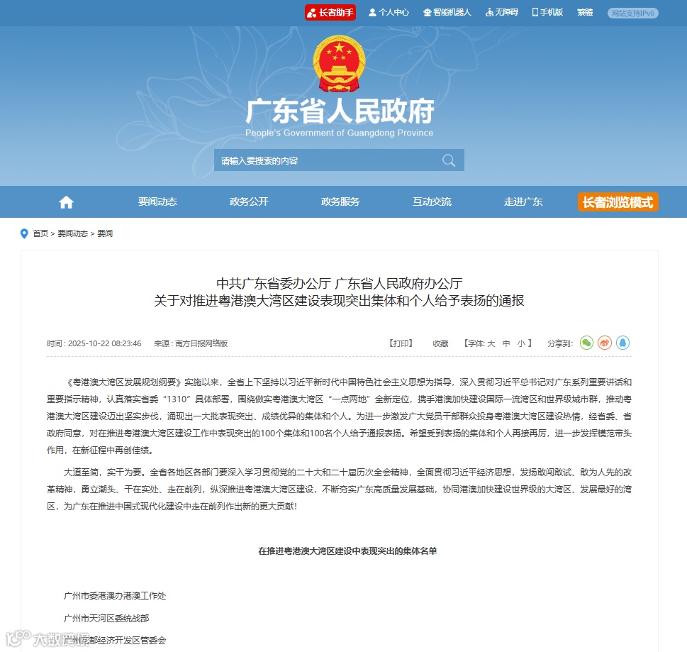 2025年10月22日,中共广东省委办公厅、广东省人民政府办公厅发布《关于对推进粤港澳大湾区建设表现突出集体和个人给予表扬的通报》,对在推进粤港澳大湾区建设工作中表现突出的100个集体和100名个人给予通报表扬。在受表彰的集体中,深圳市前海梦工场运营有限公司、前海国际人才服务中心、深圳出海e站通三大平台同时上榜。这些集体作为粤港澳大湾区建设的生动实践者,正助力前海打造成为粤港澳深度合作的示范区域。