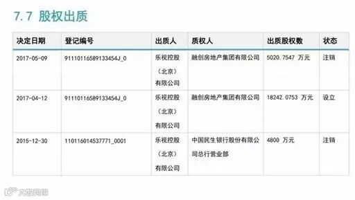 记者在第三方独立软件上,找到了与上述表述互为佐证的资料——乐视影业内部发生过巨大股权出质的情况。第一股东乐视控股将其在乐视影业的99.94%的股权质押给二股东的实际控制方融创。该等股权出质中仅一小部分被注销。鉴于乐视控股和贾跃亭的资金状况,他们应该很难偿还剩余债务,要解除质押,很有可能得部分或全部划转标的物。