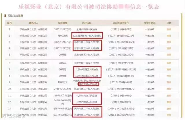 国家企业信用信息公示系统显示,截至2017年6月30日,乐视影业(北京)有限公司有14笔司法冻结,除了周一被媒体爆出的上海高级人民法院冻结的乐视控股持有乐视影业股权外,还有13笔其他冻结,涉及到全国的六大地方法院,分别为北京市高级人民法院、第三中级人民法院、第四中级人民法院、朝阳区人民法院、天津市第二中级人民法院和山东省济南市中级人民法院。