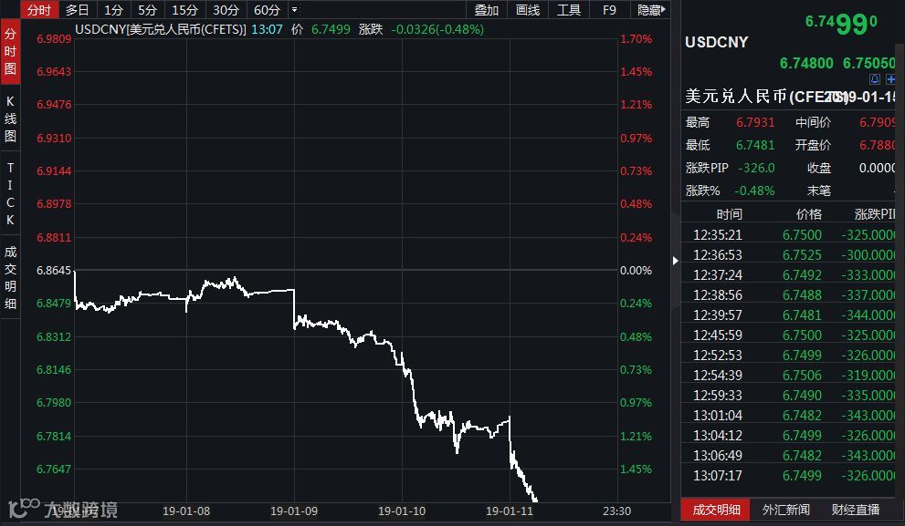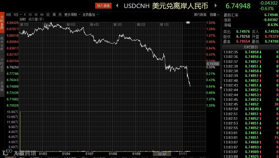 如果从1月7日收盘价6.8499算起,近一周时间内,在岸人民币升值幅度超1000点。