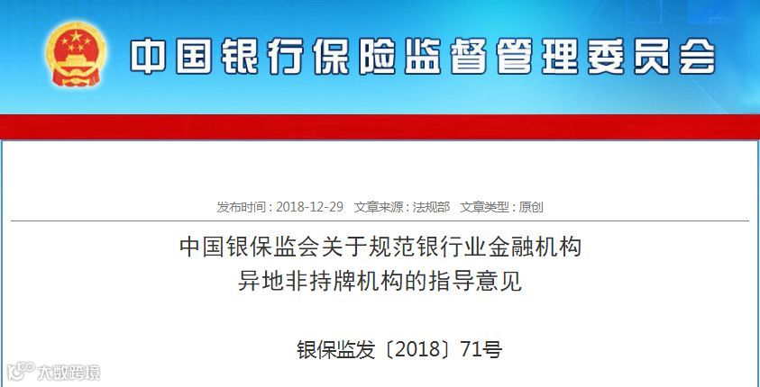 在刚刚过去的2018年12月末,银保监会发布了2018年最后一项规范条例《关于规范银行业金融机构异地非持牌机构的指导意见》(下称《指导意见》),对银行业金融机构异地非持牌经营行为进行规范。