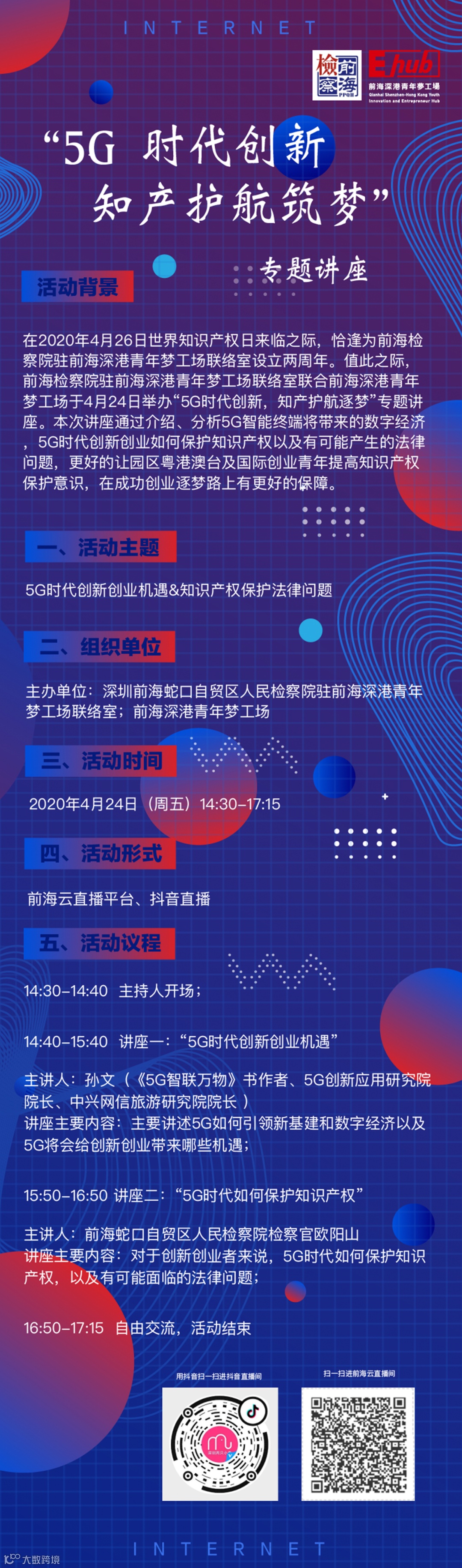 在2020年4月26日世界知识产权日来临之际,恰逢为前海检察院驻前海深港青年梦工场联络室设立两週年。值此之际,前海检察院驻前海深港青年梦工场联络室联合前海深港青年梦工场于4月24日举办“5G时代创新,知产护航逐梦”专题讲座。本次讲座通过介绍、分析5G智能终端将带来的数字经济,5G时代创新创业如何保护知识产权以及有可能产生的法律问题,更好地让园区粤港澳台及国际创业青年提高知识产权保护意识,在成功创业逐梦路上有更好的保障。