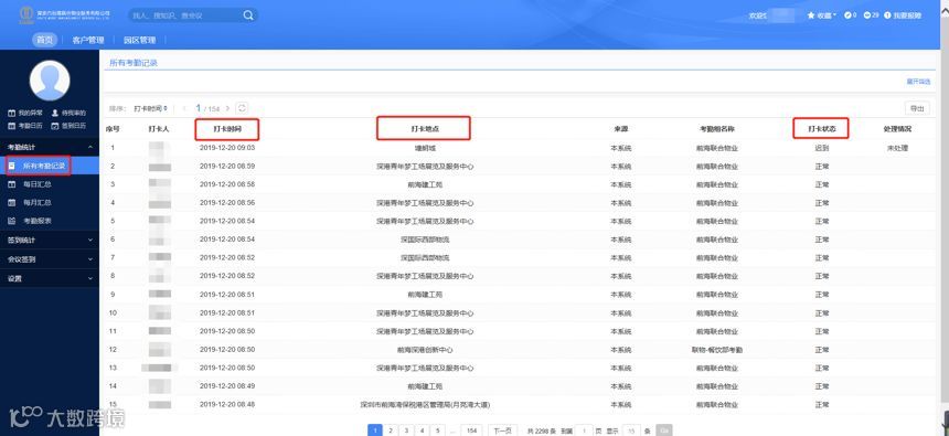 在“数字化园区管理平台”所有功能中,比较特色的便是前海园区实现移动打卡考勤功能。由于联合物业的服务项目较多,员工基本都分散在各个项目现场,项目之间的业务往来路途遥远,办事的时候人员流动性比较高。虽然各个项目均配有各自的考勤机,但考勤机的数据格式不统一,无法实现考勤数据共享,给实际工作带来不便 。