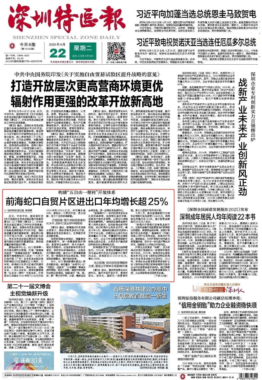 4月22日,深圳特区报头版刊发报道《构建“五自由一便利”开放体系 前海蛇口自贸片区进出口年均增长超25%》。
