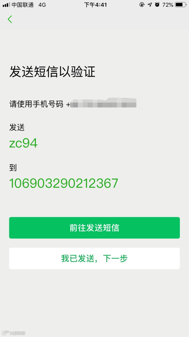 STEP3:使用注册手机根据提示发送短信,注册成功。
