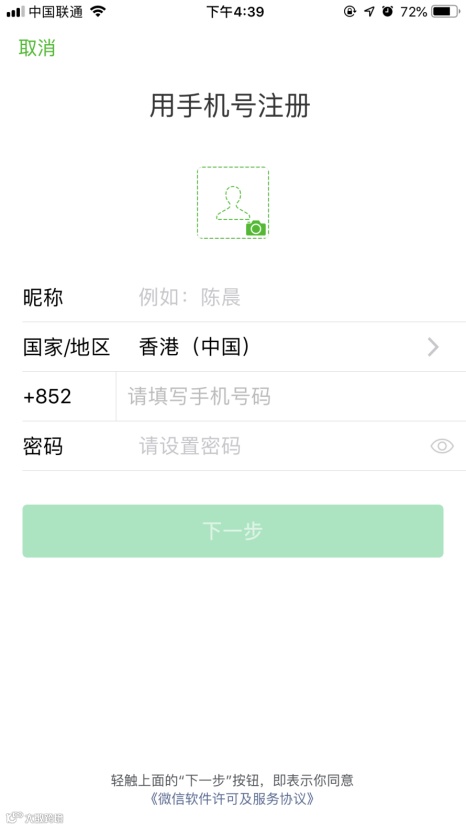 STEP1:通过应用商店或App Store下载“微信”,进入后点击注册,填入相关信息;