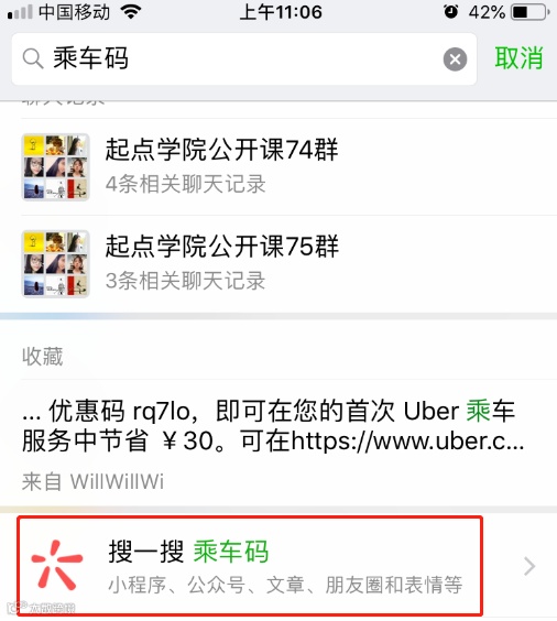 STEP2:在微信搜索页面,输入“乘车码”,在搜索结果中,点击“搜一搜 乘车码”。