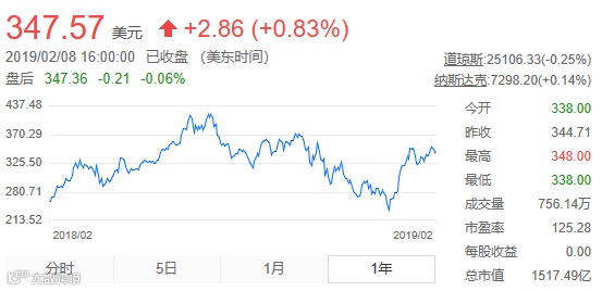 ——2019年2月8日,Netflix股票收盘价347.57美元,市值1517.49亿美元。下图为过去一年Netflix的股价走势。