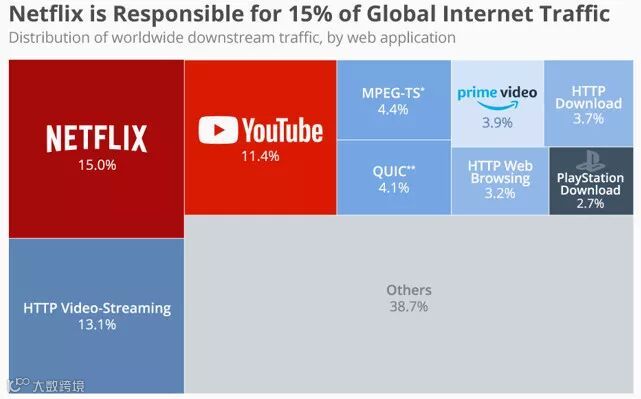 ——2018年10月,带宽管理公司Sandvine报告显示,Netflix一家即消耗了全球(不含中国和印度)15%的网络流量。