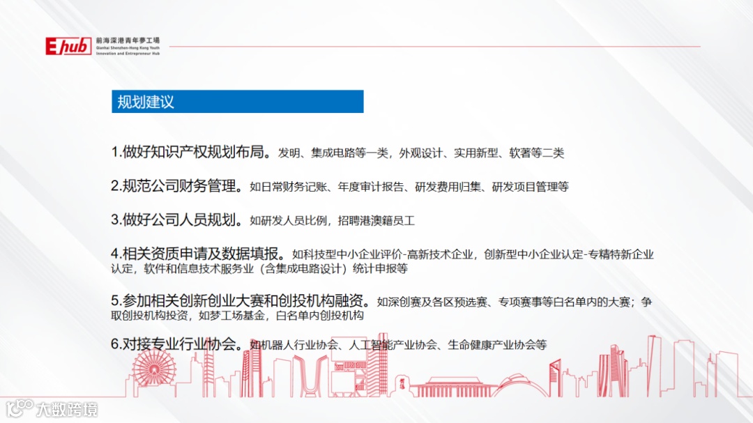 活动第三阶段,基于四个创业补贴项目的特点,给出了6点建议帮助企业做好申报规划,例如做好知识产权规划布局、规范公司财务管理、做好公司人力资源规划、开展相关资质申报及数据填报、参加创新创业大赛及对接创投机构、对接专业性行业协会等,并着重提醒企业关注2025年度前海保障性租赁住房定向配租事项。