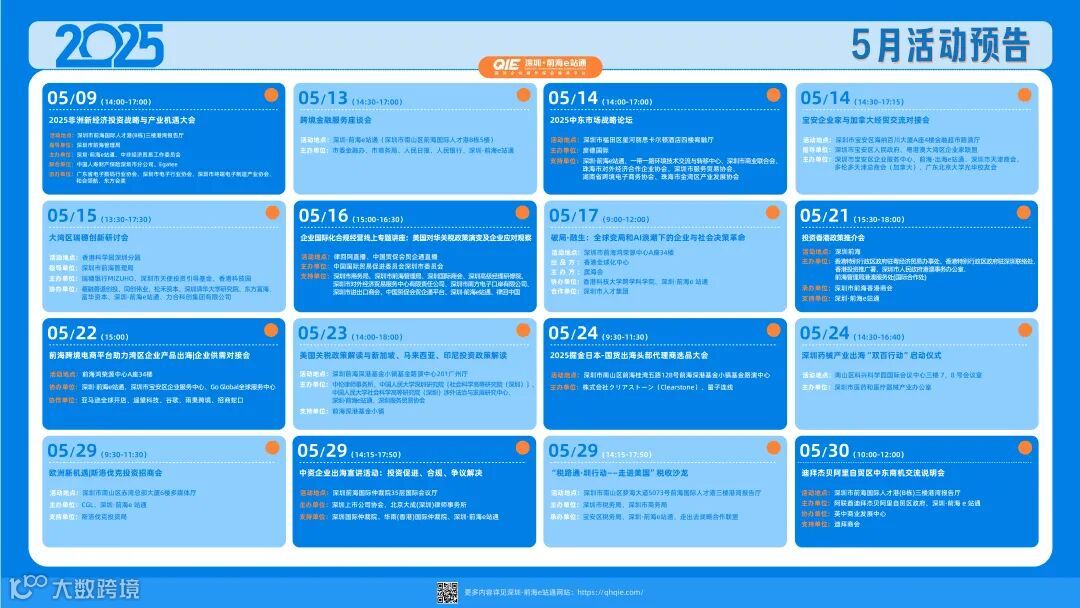 2025年5月,深圳·前海出海e站通持续发挥“平台、资源、政策”三重优势,围绕非洲、中东、日本、北美、东南亚等重点市场,组织17场聚焦实战、链接资源的专业活动,为粤港澳大湾区企业“走出去”注入澎湃动能。
