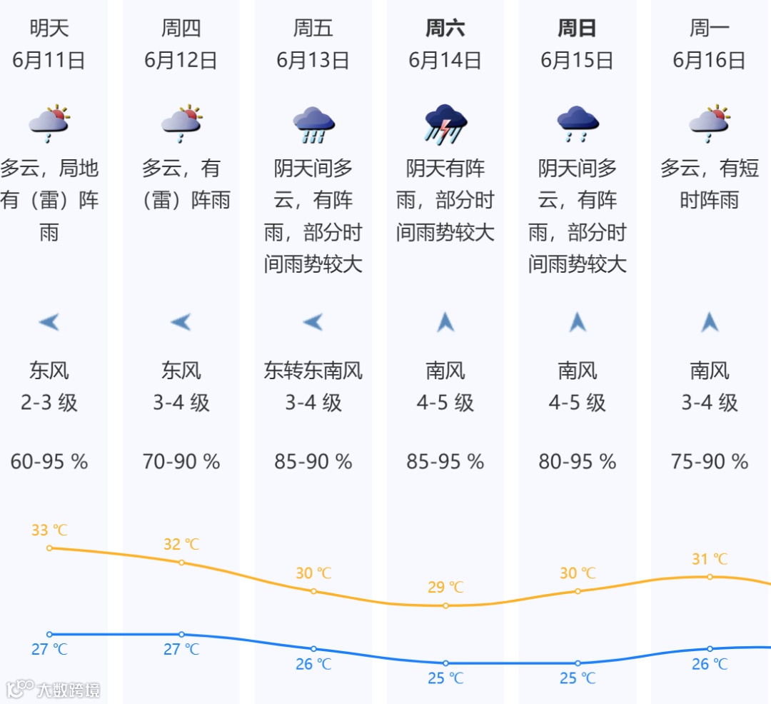 周三(11日),多云,有短时(雷)阵雨,天气仍较热;