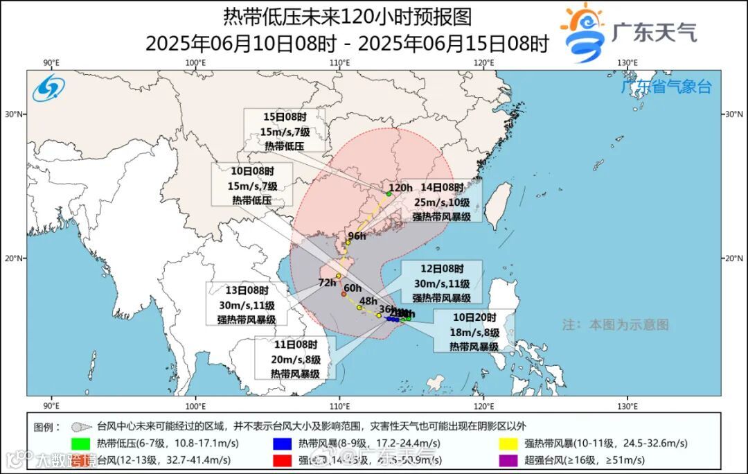海上:6月11日—14日,南海中北部海面、广东中西部海面、琼州海峡风力先后逐渐加大到8—10级,阵风11—12级;其中台风中心经过的附近海面旋转风10—12级,阵风12—13级。