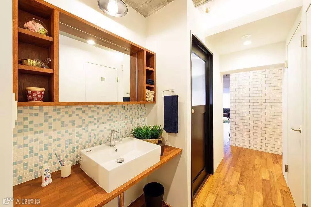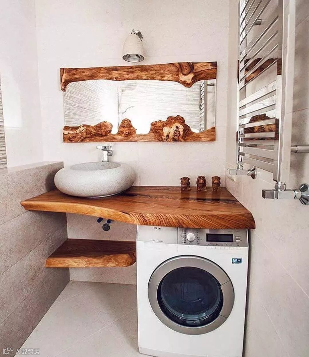 干区还把洗衣机给塞进来了,原木色的台面与镜框漂亮极了。