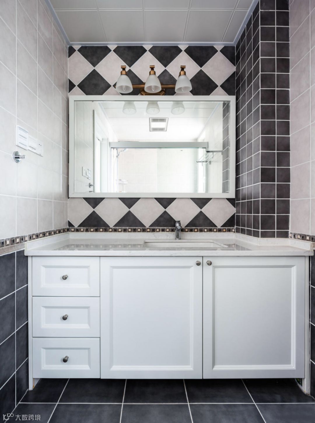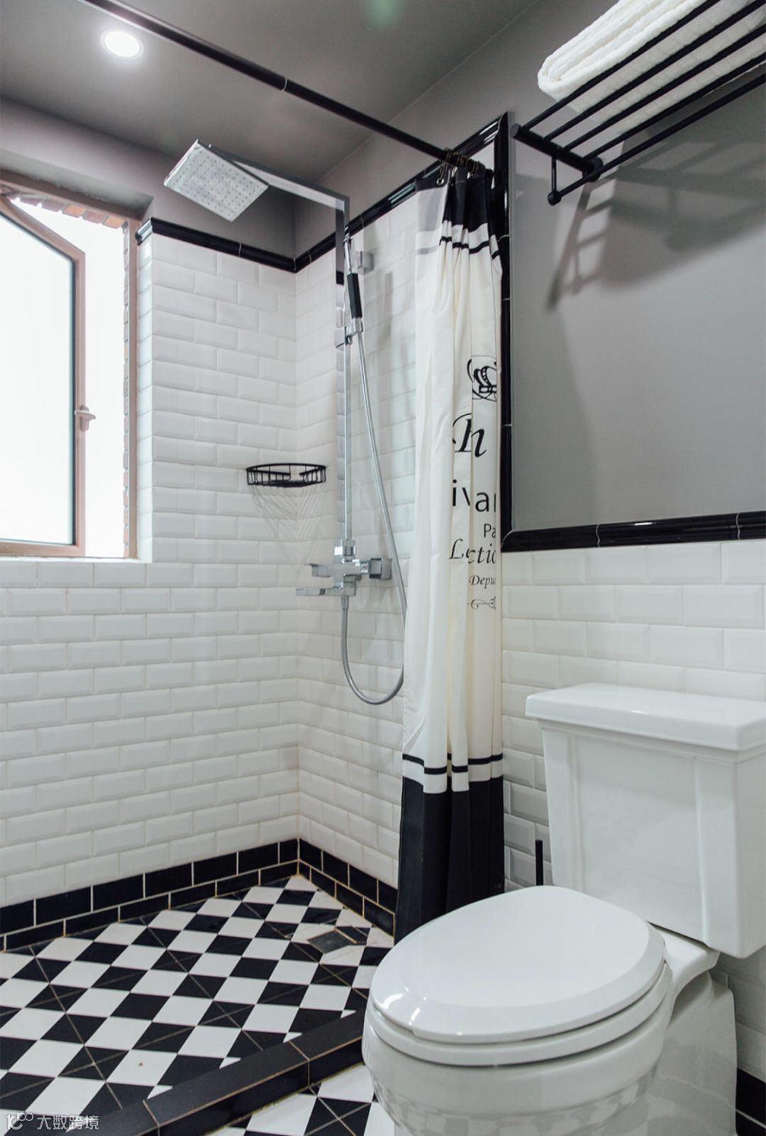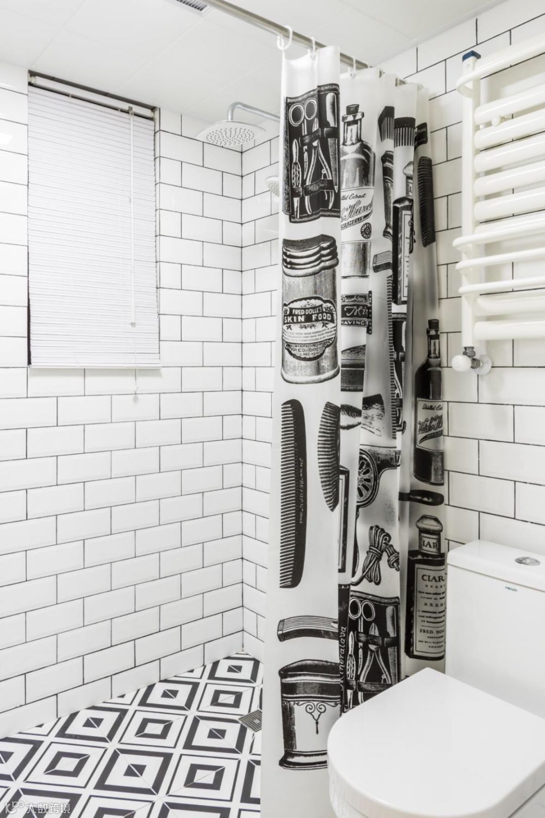 浴帘颜色、花纹的选择也非常重要,这种黑白花纹浴帘配上黑白花砖,颜值也是很高。