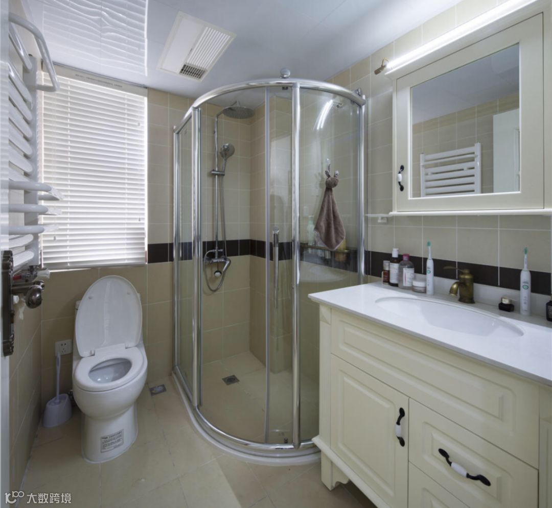 这是一种是很常见的分离方式,墙角有弧度的玻璃隔断,洗手台和马桶会紧挨在两侧,既能干湿分离,避免磕磕碰碰,也很节省地方。