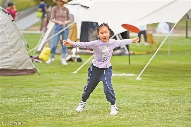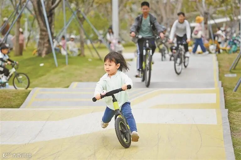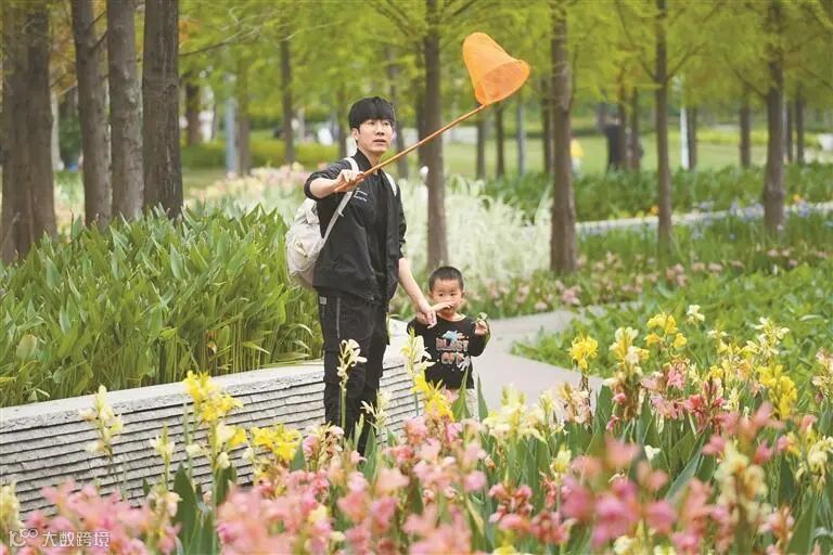 再往前,全新开放的双界河公园绿意正浓。园内沿河打造了一条生态长廊,将湿地景观、慢行绿道与城市的天际线完美连接起来。在这里,可以欣赏到鹭鸟掠过水面,也能在景观桥上打卡摩天轮,园内的趸道更是小朋友骑行和玩滑板的理想场所。