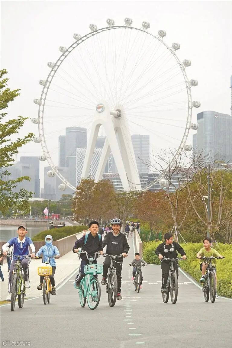 往前走,前海石公园背后是鳞次栉比的摩天大楼,面朝广阔的蔚蓝海湾,开阔的视野将以“湾区之光”摩天轮为地标的城市天际线尽收眼底。郁郁葱葱的大草坪上,风筝摇曳,帐篷朵朵,世外桃源大抵不过如此。走过骑友们钟爱的海风桥。