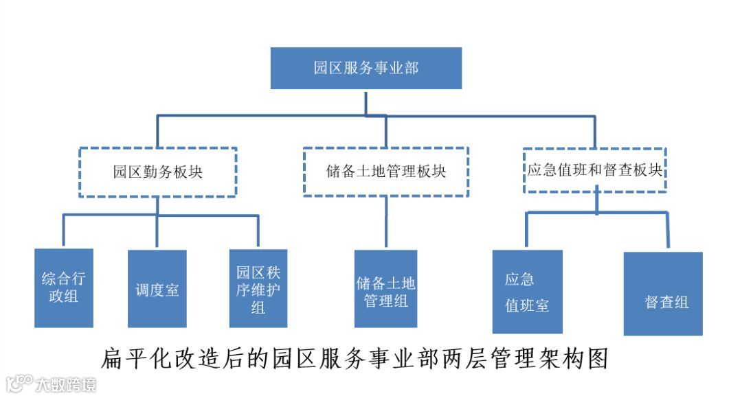 将园服部核心业务划分为园区勤务、储备土地管理共两块,另设一个应急值班和督查板块,各板块分开独立运作。针对不同业务板块进行改组,按项目化进行管理,根据职能分工总体按照“3+1+2”细分,形成两层管理架构。