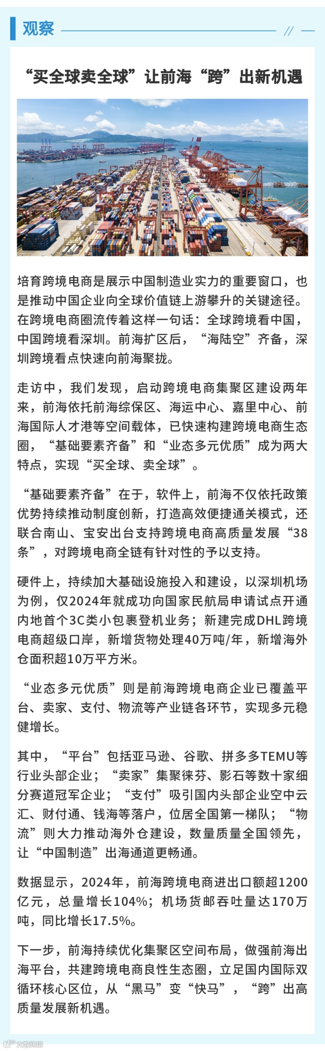随着前海大力推进跨境电商集聚区建设,仅2024年以来,谷歌公司在前海打造跨境电商加速中心、拼多多国际业务总部TEMU入驻前海、进口龙头平台行云集团在前海设立跨境电商总部……越来越多的头部企业入驻,让集聚区全链生态逐渐形成。