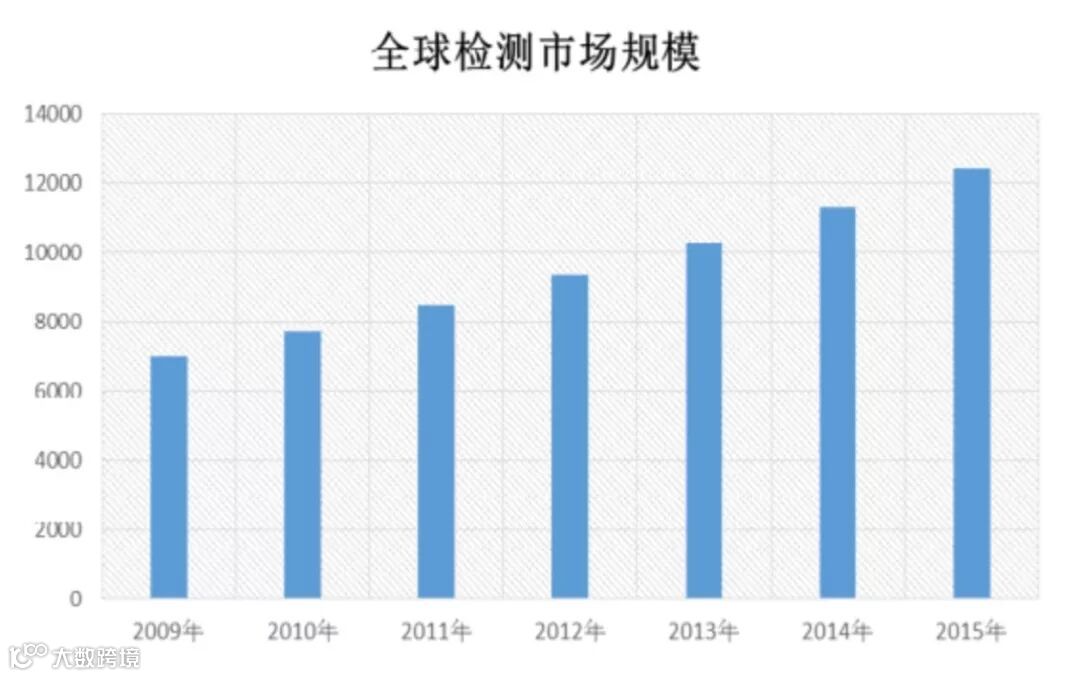当前,全球知名检验检测机构有:法国国际检验局、瑞士通用公证行(SGS)、英国天祥集团(Intertek、ITS)(19 世纪)等。随着全球经济的不断发展,终端花费和检测意愿度不断提升,检验检测服务业也取得了长足发展。2015 年全球检验检测服务业容量超过 1.2 万亿元市场总体容量。由下图可以看出,从2009到2015年呈现持续稳步上升的发展趋势。