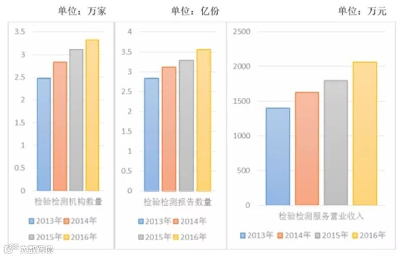 由下图统计得,2013年,检验检测服务机构共 2.48 万家、全部机构共出具检验检测报告 2.83 亿份,检验检测服务营业收入 1,398.51 亿元;到2016 年,检验检测服务机构共 3.32 万家,全部机构共出具检验检测报告 3.56亿份,检验检测服务营业收入 2,065.11 亿元。