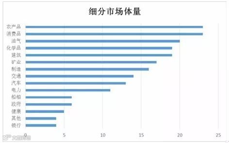 图:细分市场体量(各行业中消费品和农产品为最多,接近25%)