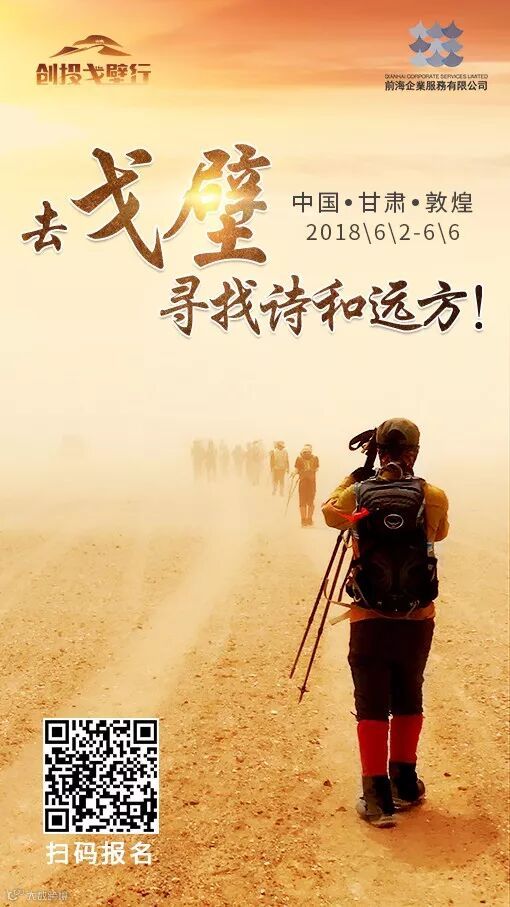 尊敬的朋友们!由中国投资人户外联盟(筹)、中国天使投资人联盟、草根天使会、前海企服联合百家创投机构、创投社团、创投媒体发起的创投圈户外顶级盛会【第三届“创投戈壁行”徒步挑战赛】暨首届创投戈壁高峰论坛以及中国投资人户外联盟成立仪式将于2018年6月2日-6月6日在敦煌拉开帷幕!开疆扩土,300+创投豪杰在戈壁天地间肝胆相照、同行共进!扫描二维码报名选择发起众筹或自行付费去戈壁探索更强大的自己吧!