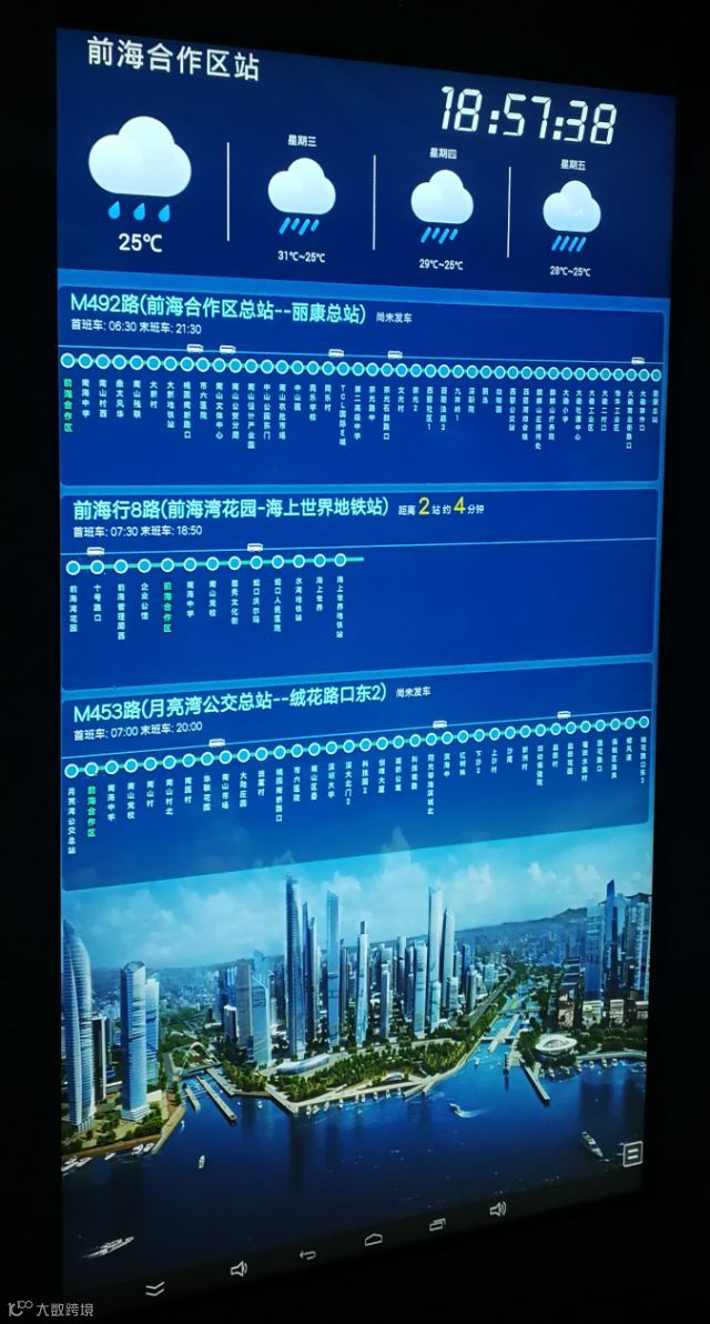 目前,经过前海合作区的公交线路为M492路、前海行8路、M453路,电子站牌上可以显示时间、天气情况,以及车辆的路线信息、到站信息,乘客可即刻获知所乘车辆的行驶位置以及到站时间,遇到上下班高峰期多辆车同时进站的情况,乘客无需在站台上张望、跑动查看后车是不是自己要坐的车,只要抬头看看电子站牌即可。