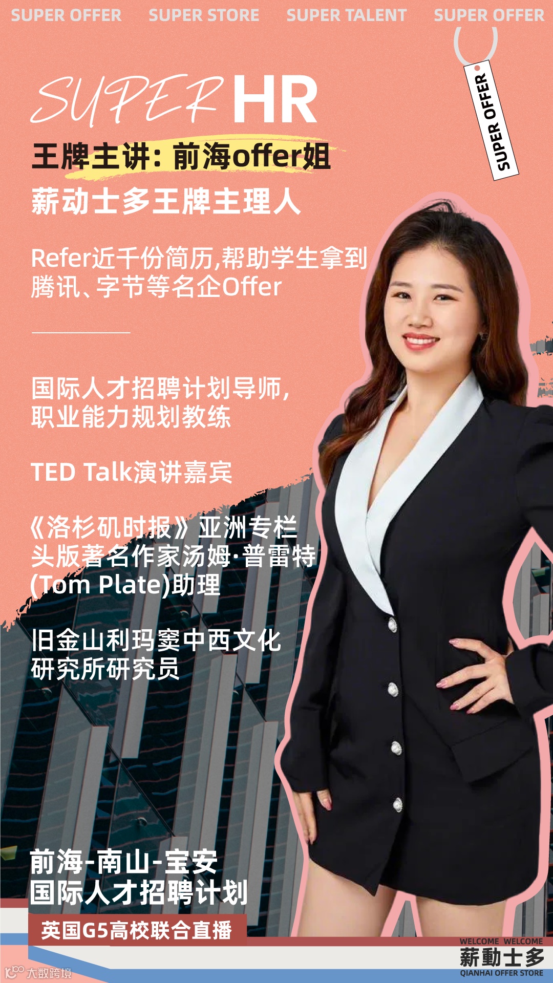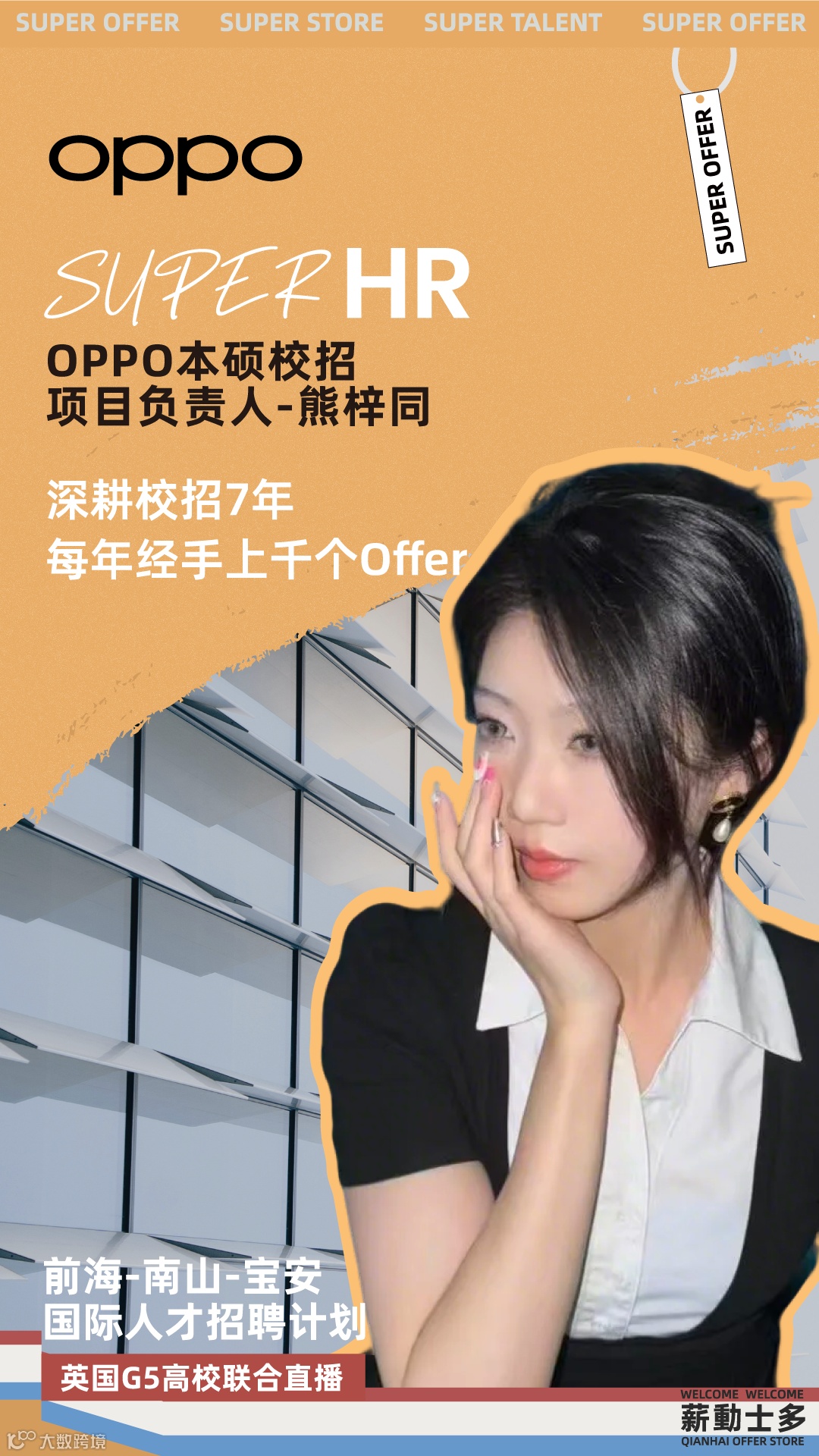 本次直播招聘活动面向全球人才开播,OPPO、TCL实业、KOS高奥士、望尘科技等五家名企HR将参与本次直播招聘会,释放500+高含金量岗位,覆盖技术开发、产品运营、市场营销等热门领域。现场更有面试直通卡、简历诊断、政策咨询等前海独家“求职助力大礼包”。除企业招聘外,“前海offer姐”将为同学们提供简历诊断、人才政策咨询、就业及创业指导服务,助力国际人才“零障碍”应聘求职。