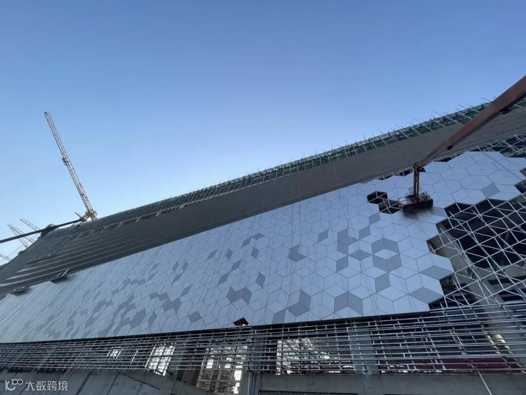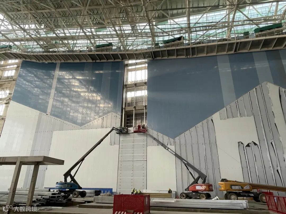 据现场中建三局的工作人员介绍,目前主体结构全面封顶,已进入装饰装修阶段。此外,酒店和配套商业部分与雪场钢结构同期封顶,机电、幕墙、精装也同步穿插施工,其中外墙现在进入了幕墙安装阶段。