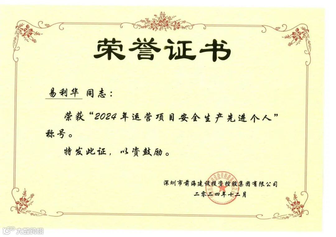 值得一提的是,物业服务中心负责人易利华同志以“时时放心不下”的责任感和“事事落实到位”的执行力,切实抓好安全生产和消防安全工作,因此获评了项目甲方颁发的“2024年度运营安全生产先进个人”称号。