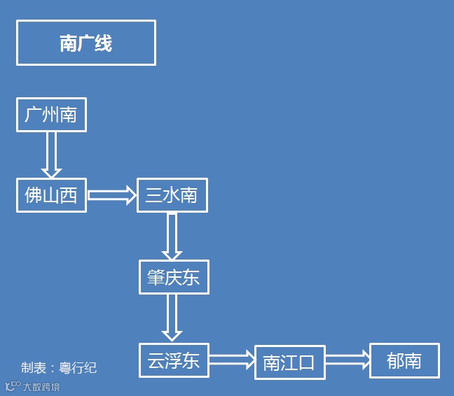 南广线途径广州、佛山、肇庆、云浮,从广州南站搭高铁至佛山西站仅需19分钟,至肇庆东站35-42分钟不等,至云浮东站57-69分钟不等。