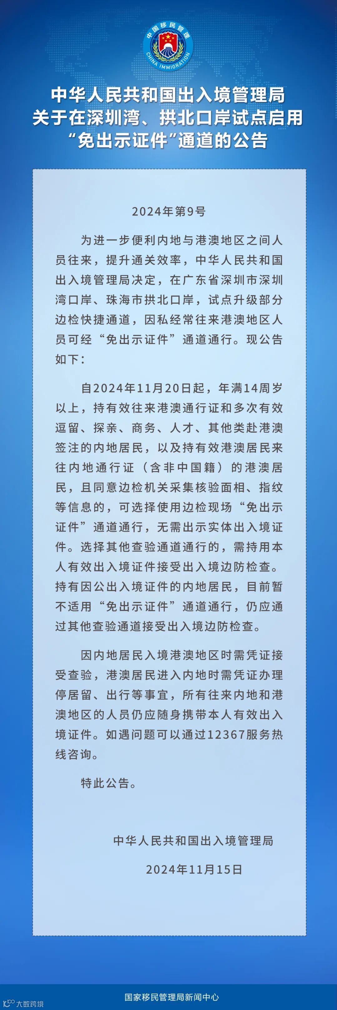 中华人民共和国出入境管理局11月15日发布公告,为进一步便利内地与港澳地区之间人员往来,提升通关效率,自2024年11月20日起,在广东省深圳市深圳湾口岸、珠海市拱北口岸,试点升级部分边检快捷通道,因私经常往来港澳地区人员可经“免出示证件”通道通行。