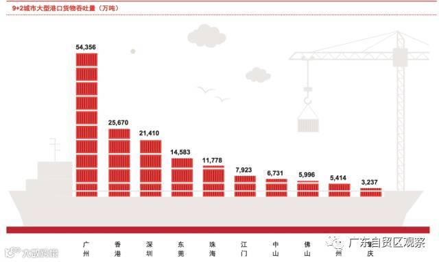 单从港口吞吐量来看,2016年粤港澳大湾区港口集装箱超过6500万箱,是排名第二的东京湾区的8.5倍。日本贸易振兴机构广州代表处所长天野真也说,深圳、香港的港口货运量分别位列全球第三、六,两个城市的港口货运量之和已超过全球第一的上海,仅这一数据就反映了粤港澳大湾区经济的惊人容量。