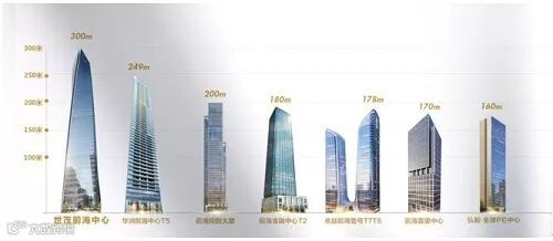 从建筑高度方面来看,前海片区以上这些达到150米的写字楼建筑,高度方面也已经"很出挑",对比之下,有着约300米建筑高度的世茂·前海中心,暂领风骚。