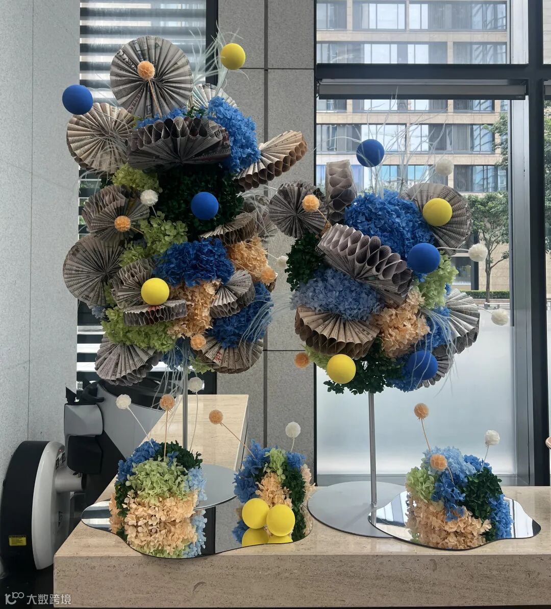 采用废旧报纸与永生花搭配制作成造景摆台,选用黄色、蓝色、银色、灰色等多种颜色创意搭配,造型独特,为大堂带来视觉享受的同时还展示了环保理念。