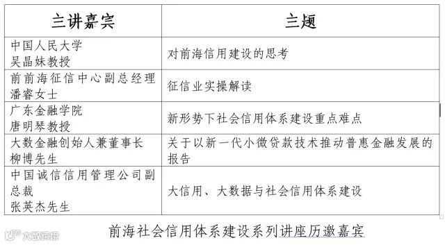 前海社会信用体系建设系列讲座举办以来,前后共邀请了5位专家就社会信用体系建设的不同领域,包括经济转型升级、业务实操、政府监管、普惠金融、前沿探索等方面,从不同角度来剖析信用服务行业发展路径以及前海蛇口自贸片区社会信用体系建设的前进方向。