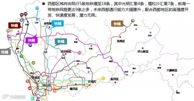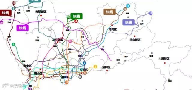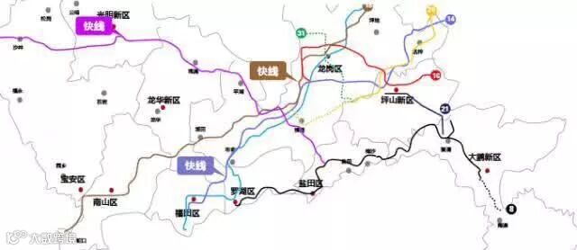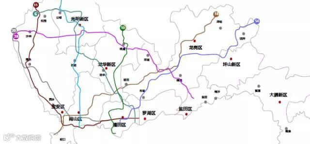 东西横向如28号线沙井横穿光明,龙华,龙岗平湖横岗,至到盐田;
