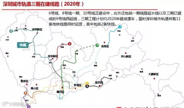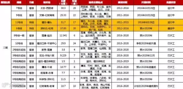 地铁三期已有7、9、11号线已于2016年10月开通运行,6、8(一期)、10号线正建设中,此外还包括一期线路的延长线,三期工程计划约2020年建成通车,届时深圳城市轨道将有11条地铁线路同时运营,其中包括2条快线。
