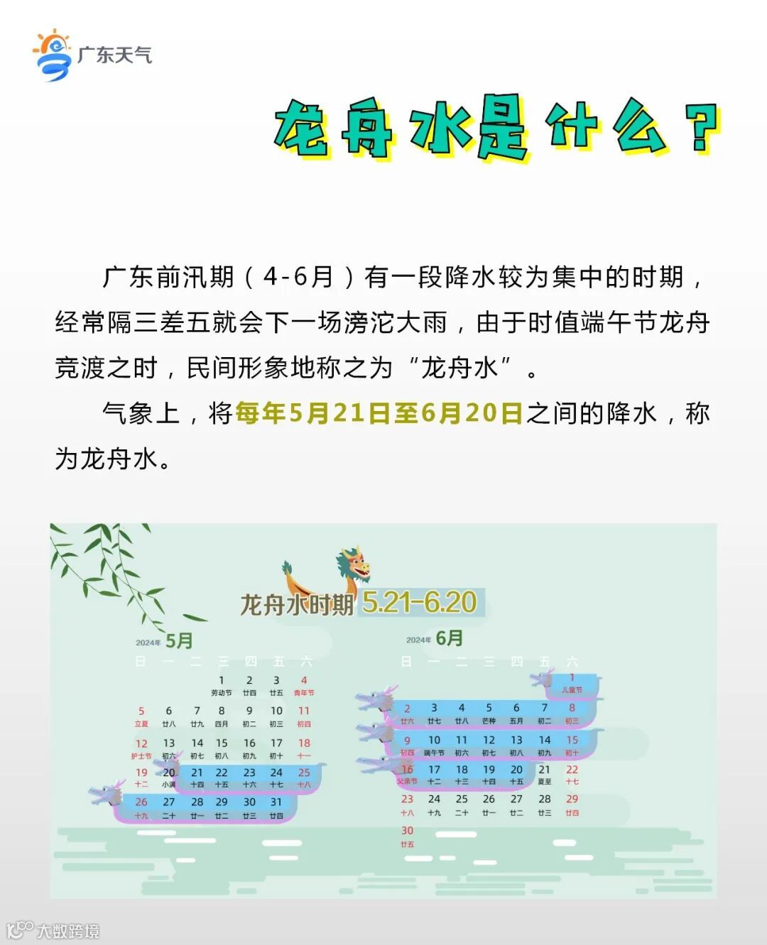 2024年“龙舟水”(5月21日-6月20日)总体比常年略偏重,主要降水时段分别在:5月19日-20日、5月25日-27日、5月29日-6月1日、6月8日-12日、6月16日-18日。