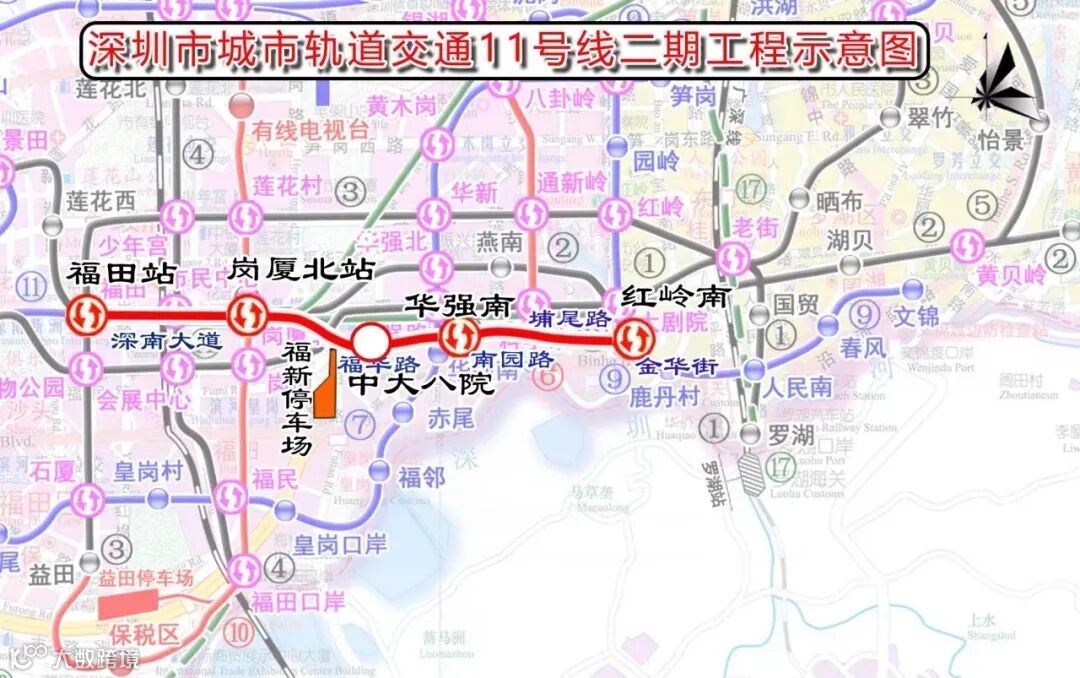 深圳地铁11号线二期起于岗厦北站(不含),止于红岭南站,线路全长约4.39千米,共设3站3区间,另含11号线机场北停车场改扩建工程。