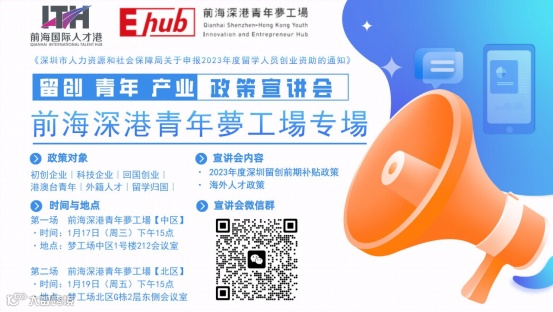 为进一步支持初创企业、科技企业、回国创业、港澳台青年、外籍人才以及留学归国人员创新创业,前海国际人才港和前海深港青年梦工场将联合举办2023年度深圳留创前期补贴政策及海外人才政策梦工场专场宣讲会。旨在为广大创新创业者提供政策解读和指导,助力企业快速发展。