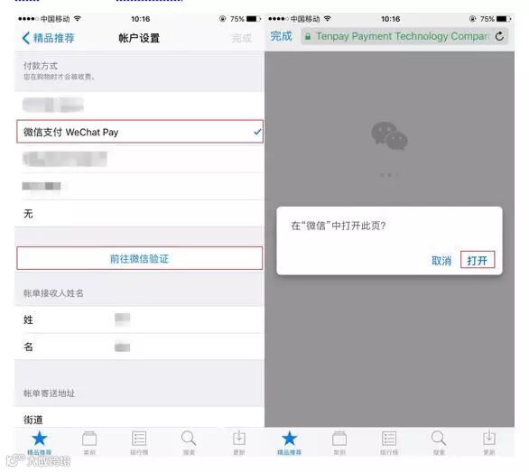 以在App Store中进行设置为例,用户在App Store首页“精品推荐”—“快速链接”中点击“绑定微信支付”,进入“账户设置”选择“微信支付 WeChat Pay”,并前往微信验证,此后将直接跳转到微信app界面。目前支持iOS 10.3以上版本用户使用。