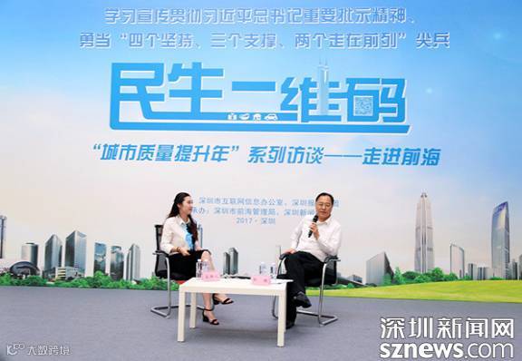 9月20日下午,由深圳市互联网信息办公室、深圳报业集团主办,深圳市前海管理局、深圳新闻网承办的广东省网络互动品牌栏目《民生二维码》——“城市质量提升年”系列访谈在前海深港青年梦工场举行。作为本期嘉宾的深圳市政府党组成员、前海管理局局长杜鹏在节目中直面民生热点问题,就前海的交通整治、新城建设、改革创新、深港合作、营商环境等多个市民网友关心的焦点问题答疑解惑,赢得现场嘉宾和市民、网友一片“点赞”。
