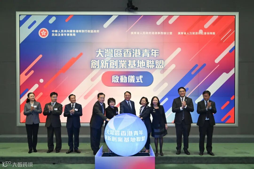 香港政务司司长陈国基(右五)12月15日下午主持「大湾区香港青年创新创业基地联盟」启动仪式。旁为广东省人民政府港澳事务办公室主任李焕春(左五)、广东省人力资源和社会保障厅厅长杜敏琪(左四)、民政及青年事务局(民青局)局长麦美娟(右四)、民青局常任秘书长林雪丽(右三)和其他嘉宾。