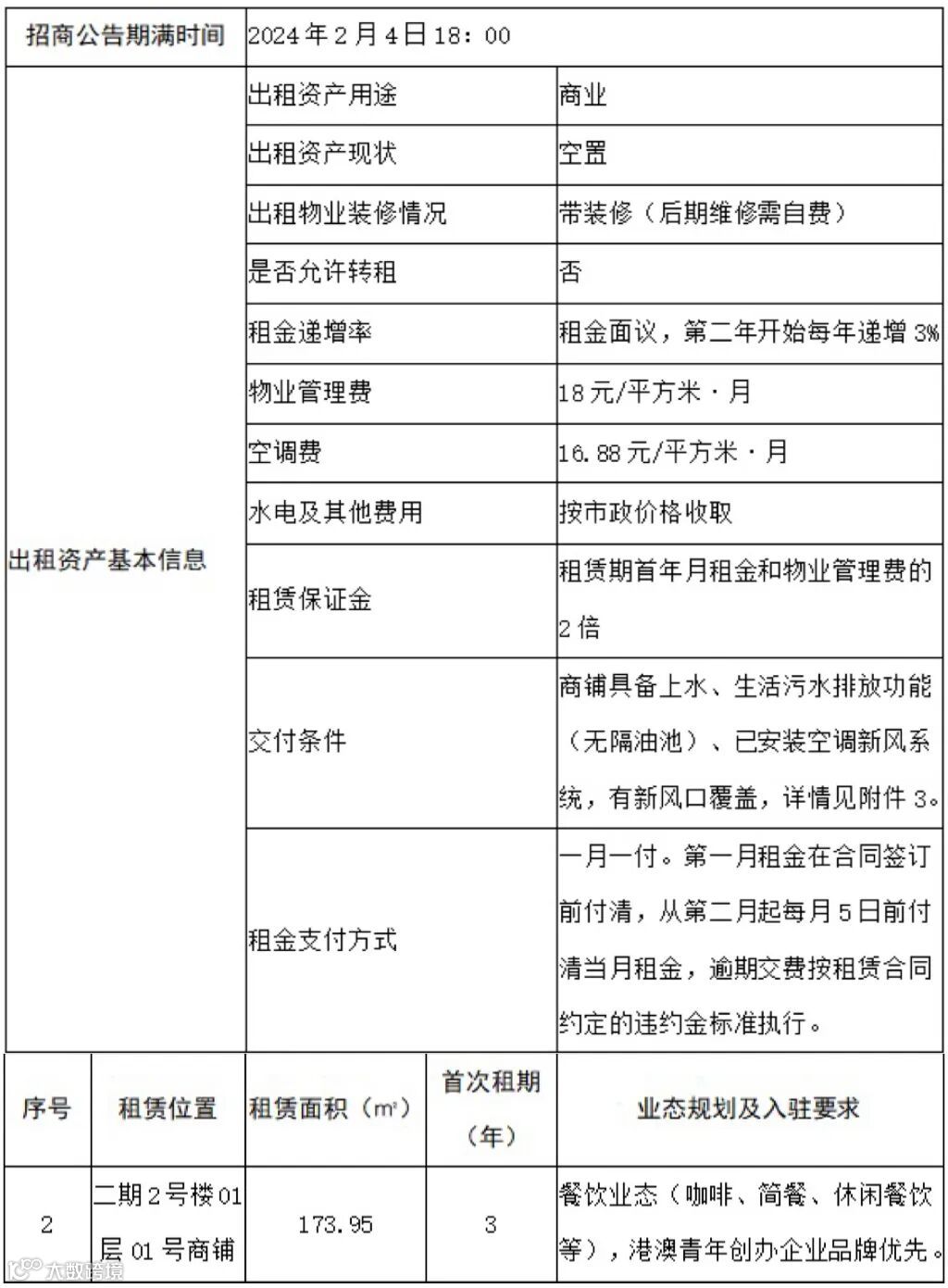 1、我司将于招商公告信息确认后,通过前海服务集团官网(https://www.qhfwjt.com)及前海服务集团微信公众号发布招商公告,并从公告发出之日起接受各商户以邮件方式报名及看场,截止到2024年2月4日18:00报名结束,报名结束后递交的报名材料无效。
