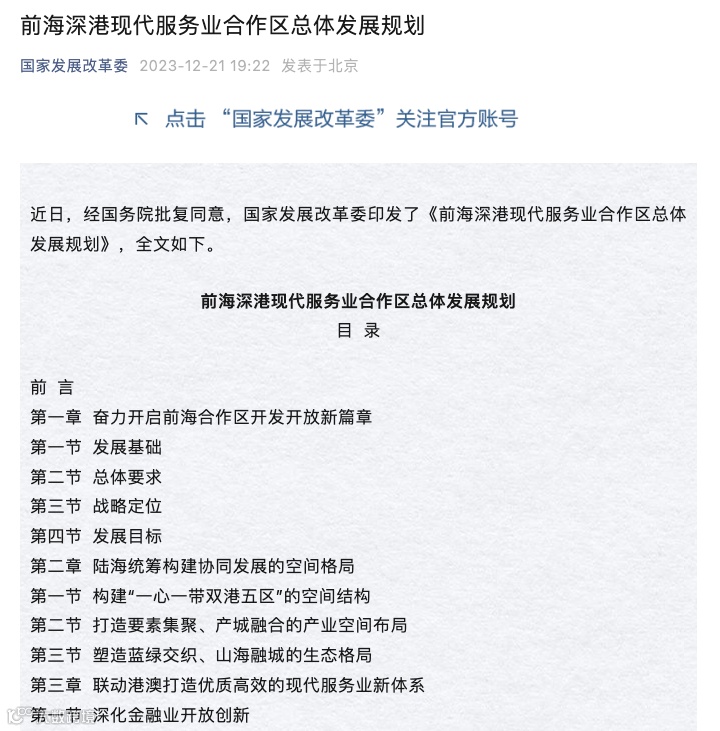12月21日,国家发展和改革委员会在官方网站上重磅发布《前海深港现代服务业合作区总体发展规划》(下称《前海总规》)全文,为前海持续扩大开发开放按下“加速键”。