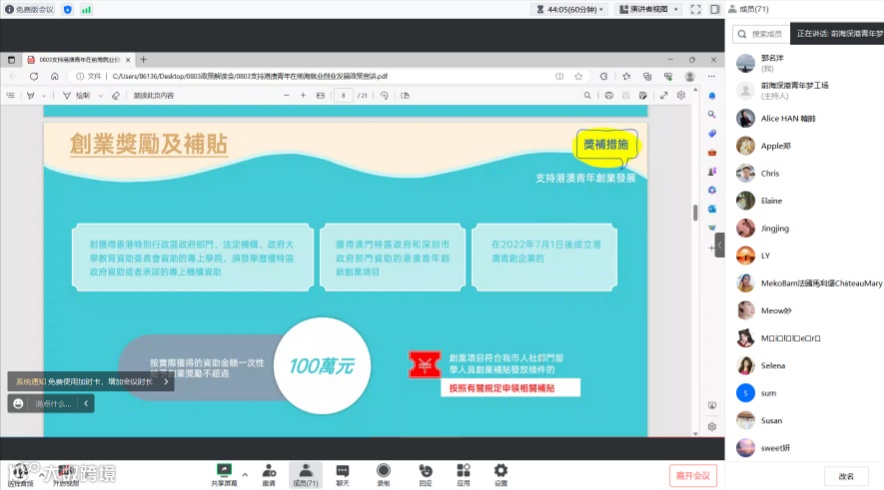 前海管理局港澳服务处从申请对象、奖补措施、奖补申领程序、申报工作等四个方面详细解读了《深圳市前海深港现代服务业合作区管理局关于支持港澳青年在前海就业创业发展的十二条措施》,并对政策发布以来大家提出的问题罗列了问题清单,让参会者对政策情况和申报要点有了清晰、全面的认识。