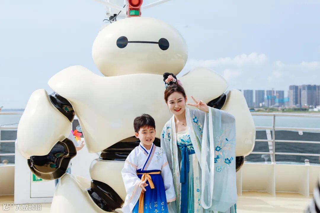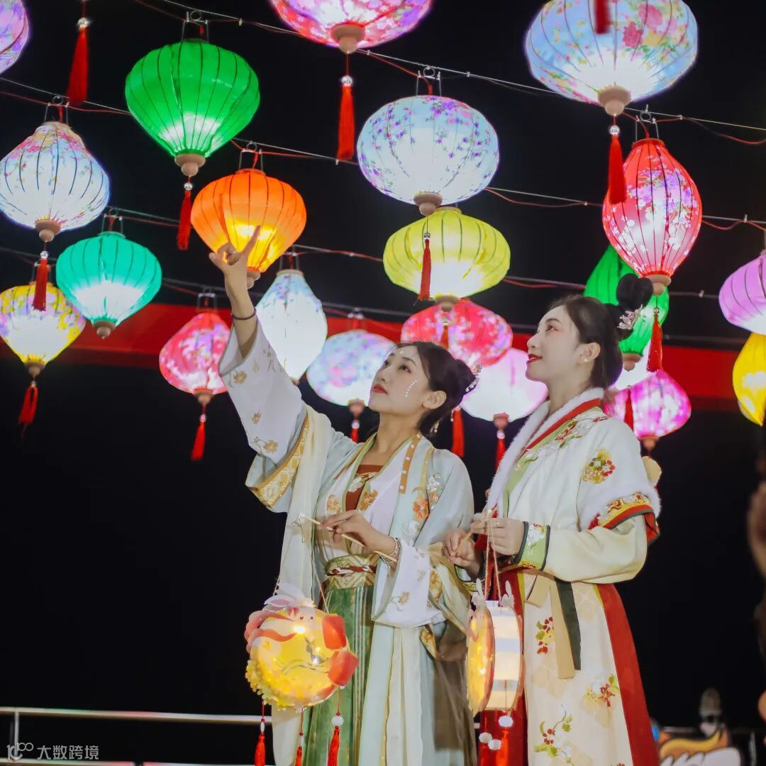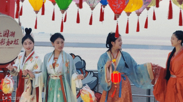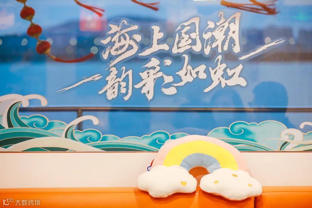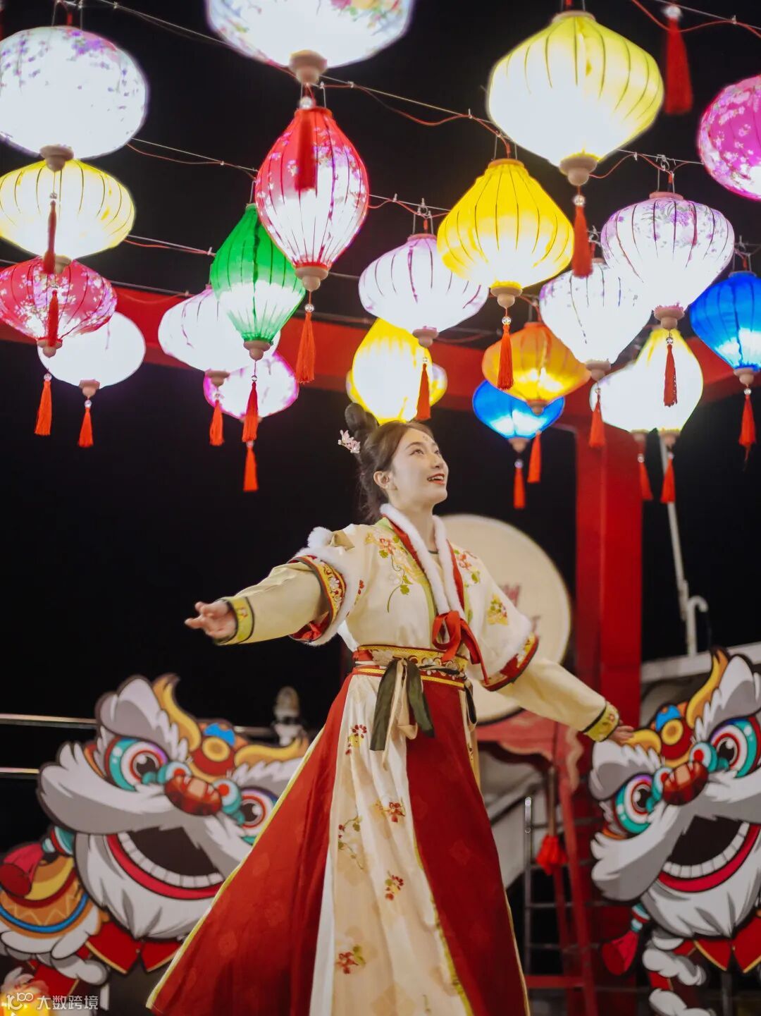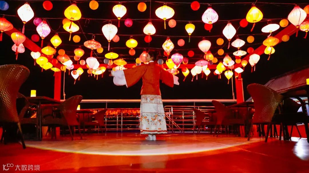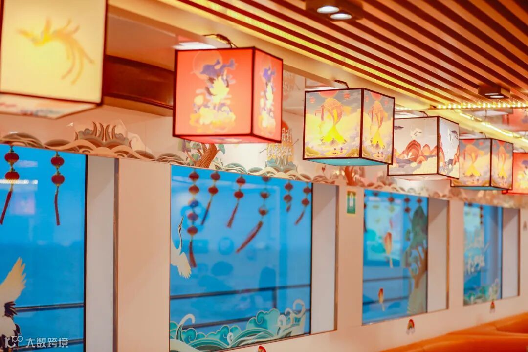 提灯漫游,流光溢彩。各具风华的彩虹号小姐姐在船舱内进行花灯走秀互动表演,游客也可以一起参与留下新年合影。